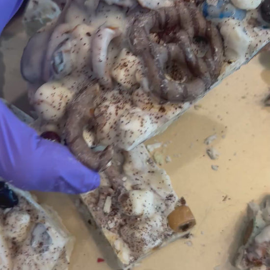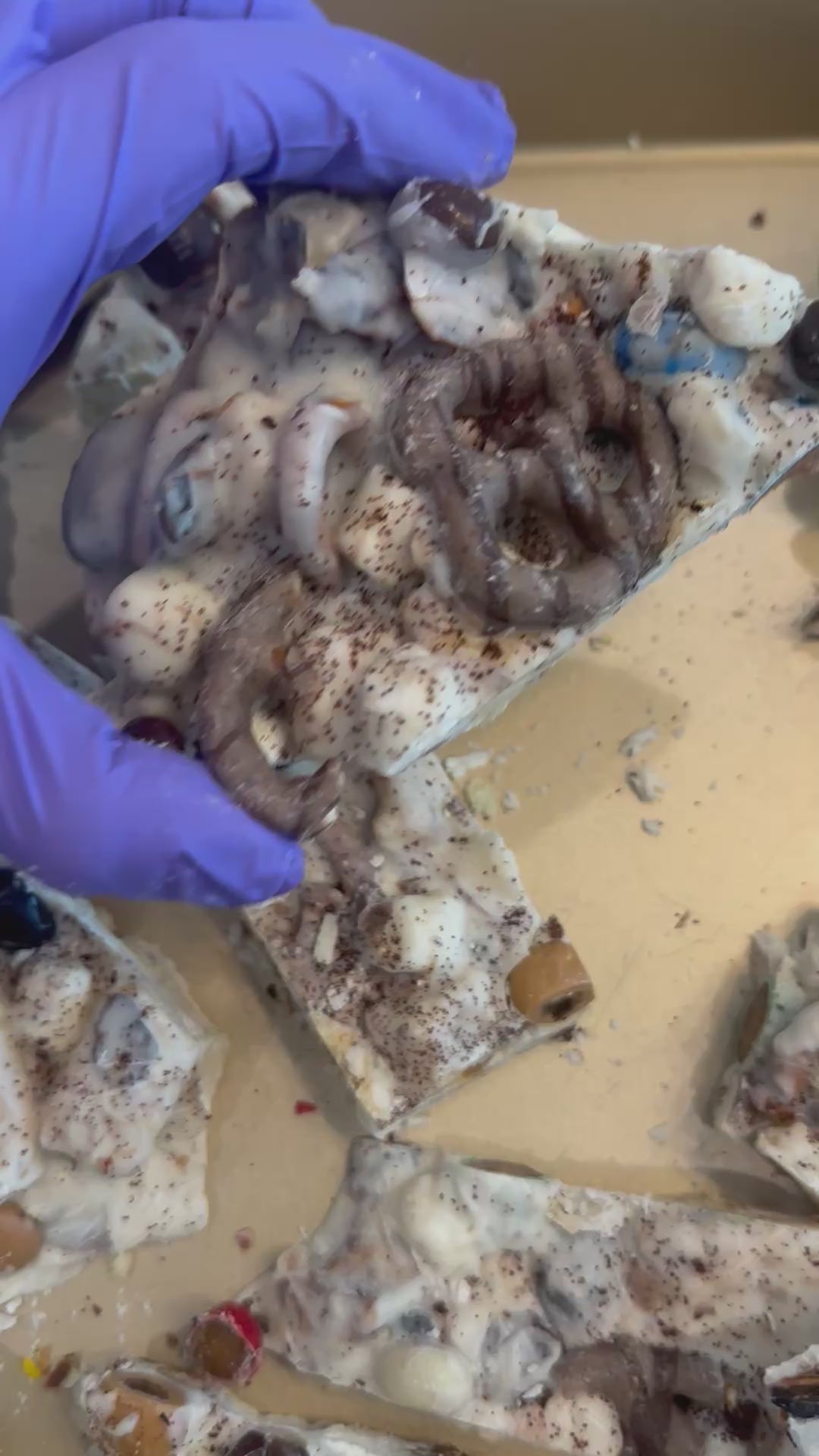 Almond infused chocolate, homemade sugar free burnt almond brittle, almond biscotti, mocha latte pretzels, cold brew caramel M&Ms, espresso chocolate bean trio, marshmallows. Topped with espresso powder