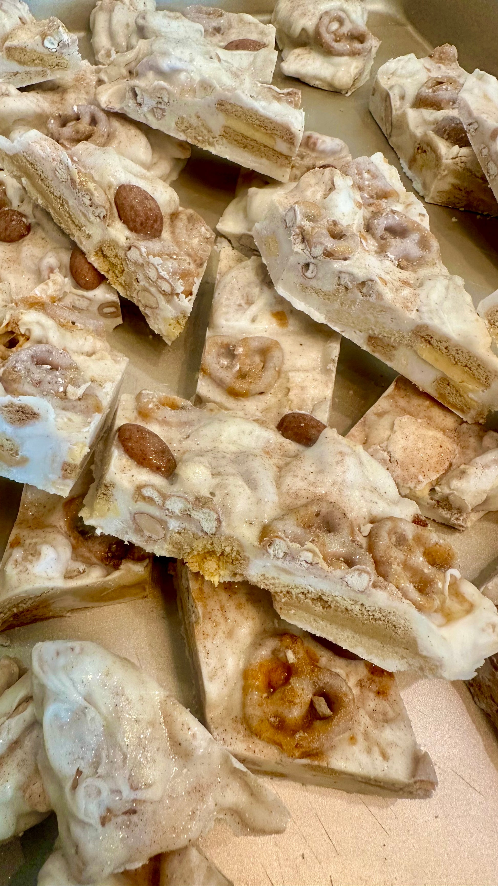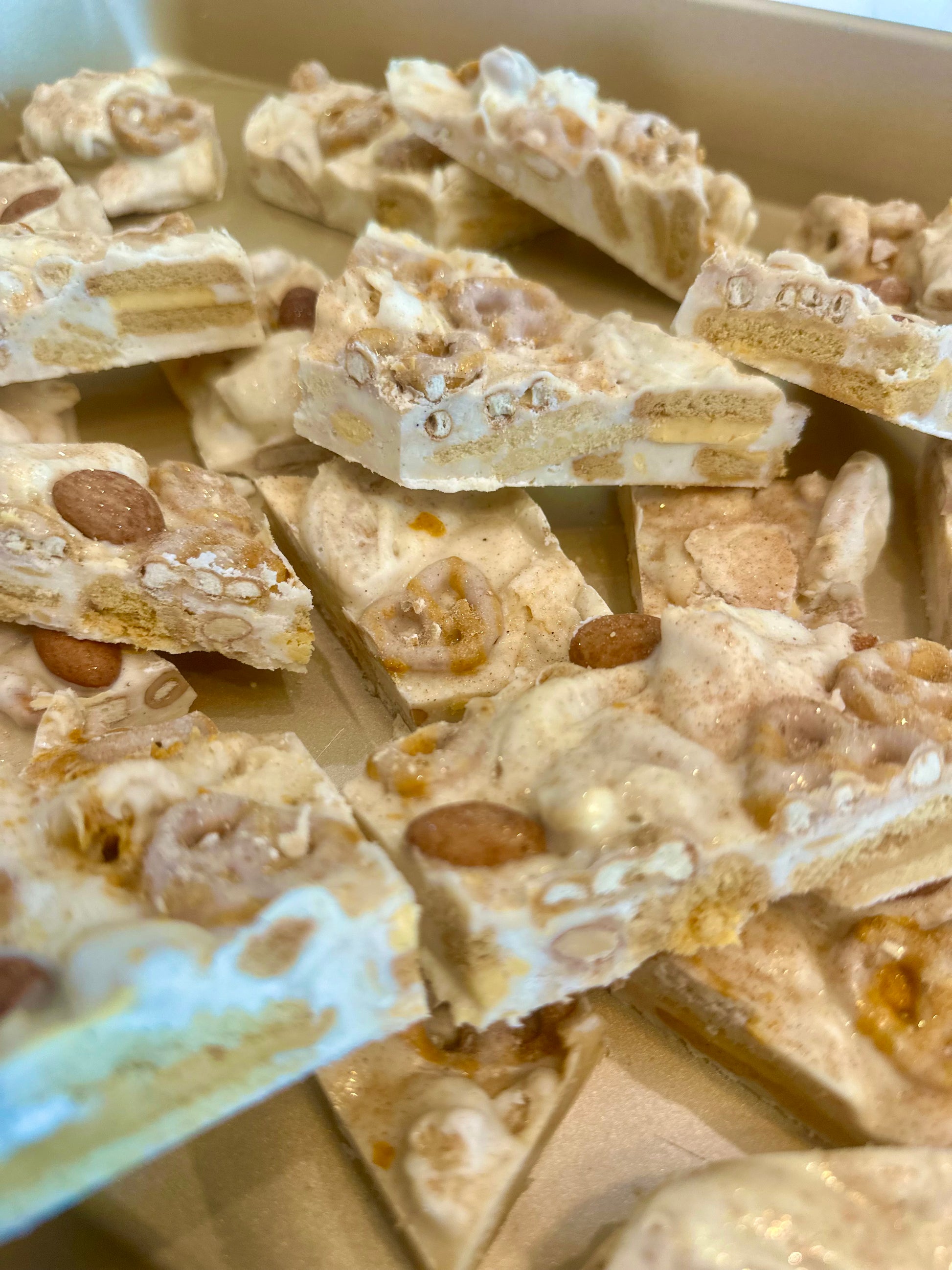 Maple and Royal Cinnamon infused white chocolate with pumpkin sandwich cookies, Apple Pie Oreos, frosted pumpkin sandwich cookies, pumpkin pretzels, and maple white chocolate almonds. Finished with Cinnamon Toast Crunch dusting and edible gold glitter.