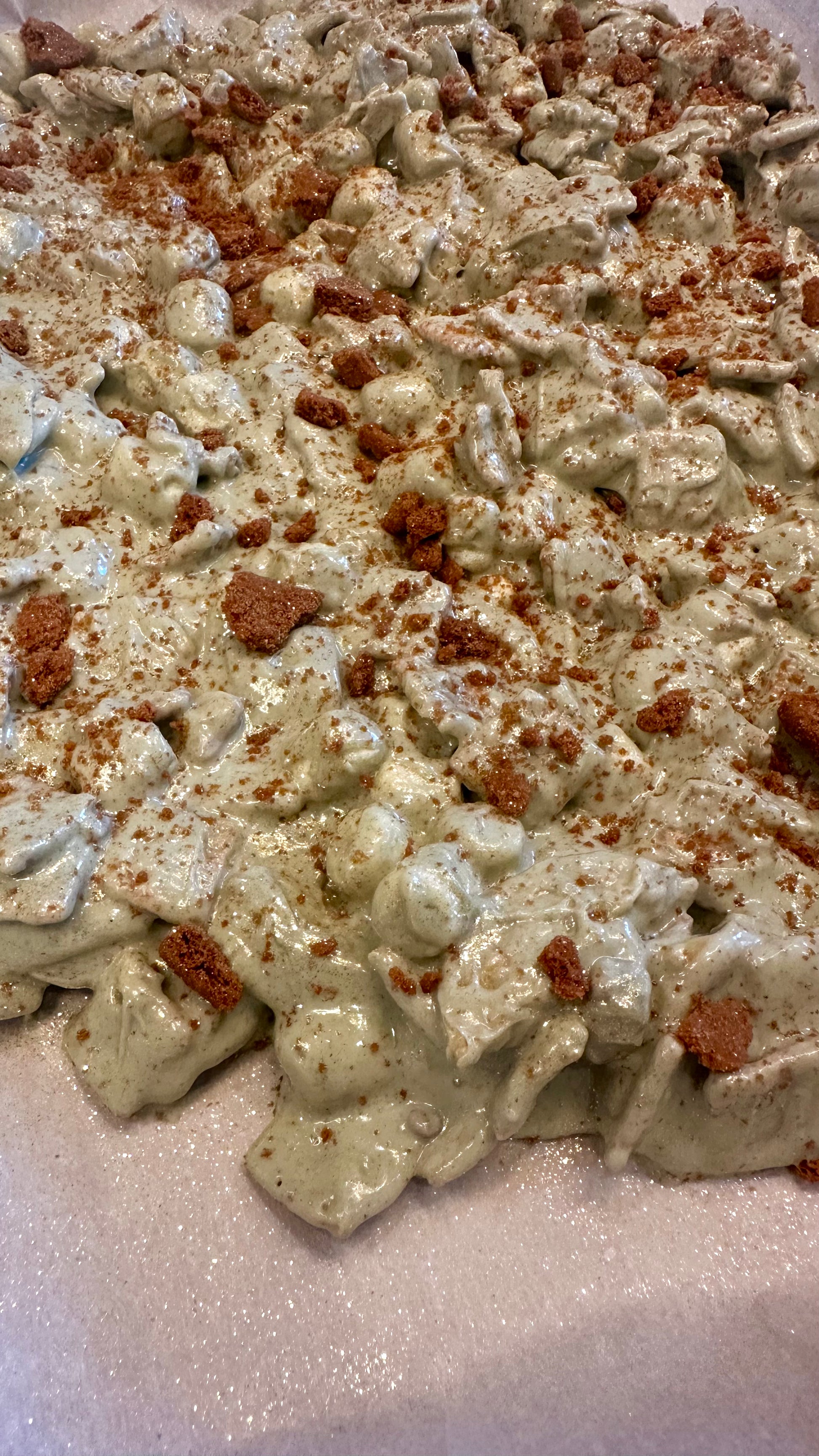 Creamy white chocolate infused with Japanese matcha, Cinnamon Toast Crunch cereal, marshmallows, Apple Pie Oreos, and biscoff cookies.