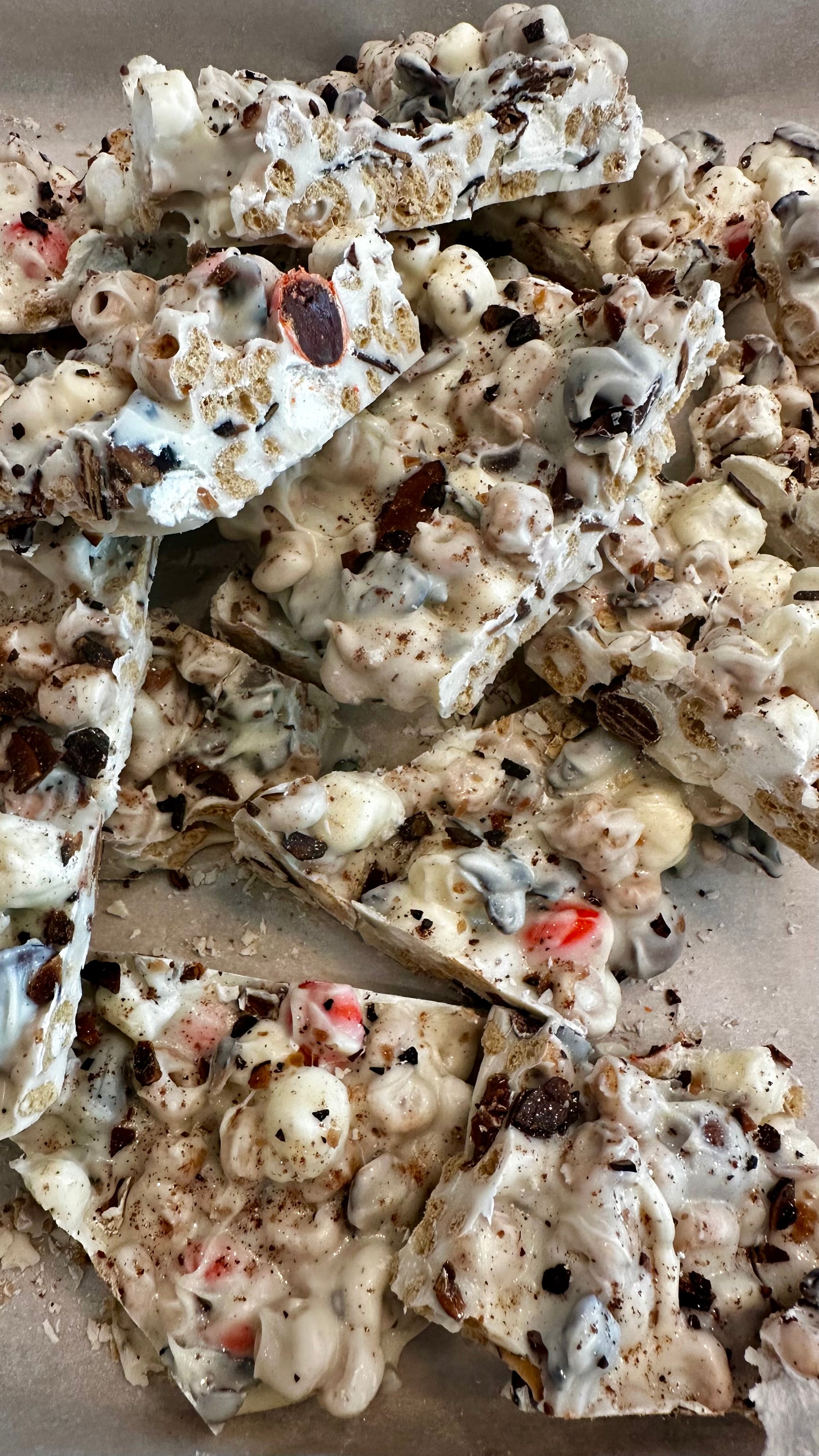 This is a pumpkin spice white chocolate, homemade sugar free blackened almond brittle, gooey marshmallows, gluten free protein cinnamon Cheerios, and m&ms! Topped with royal cinnamon, burnt almond dust and edible gold glitter 😋