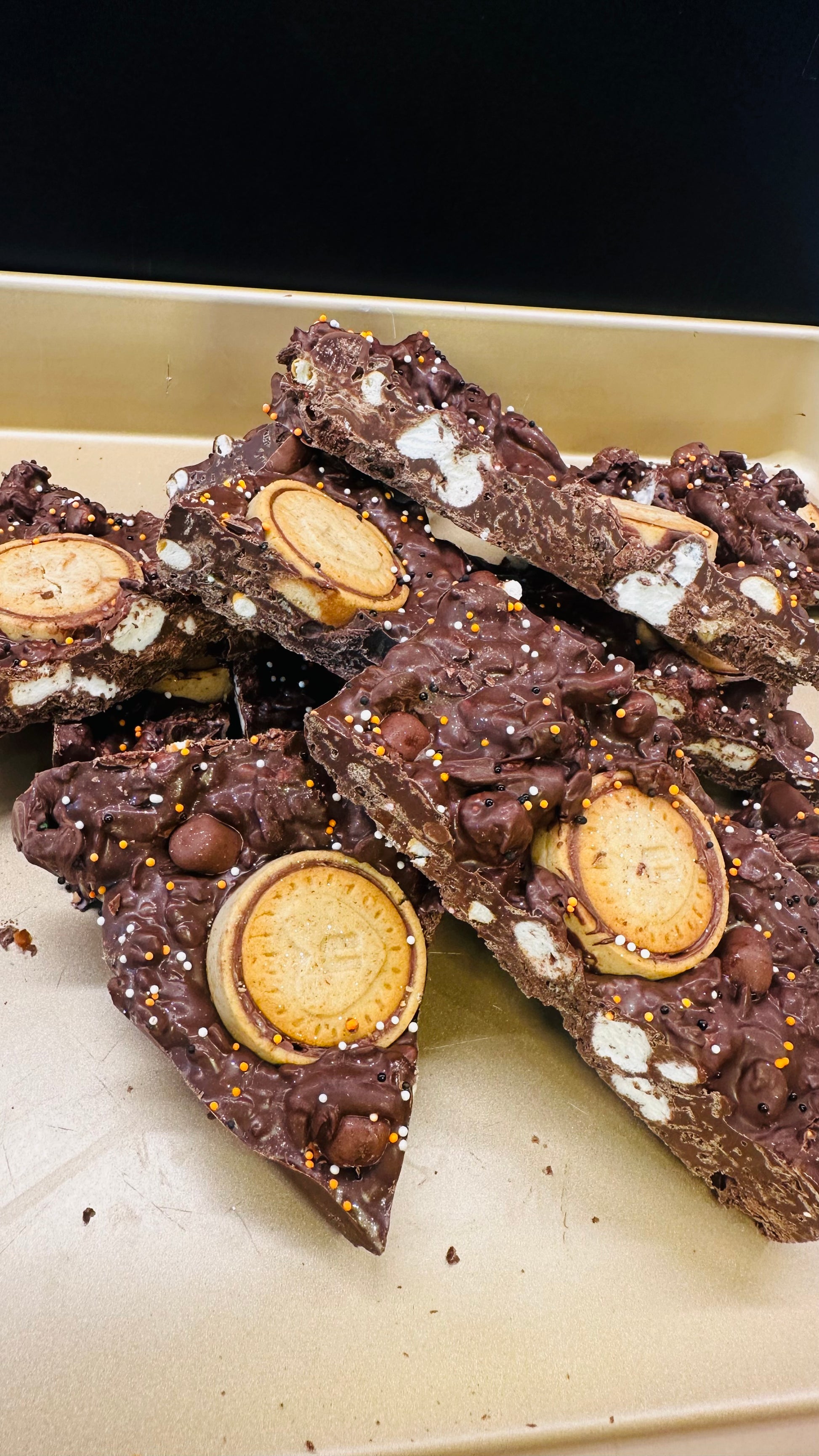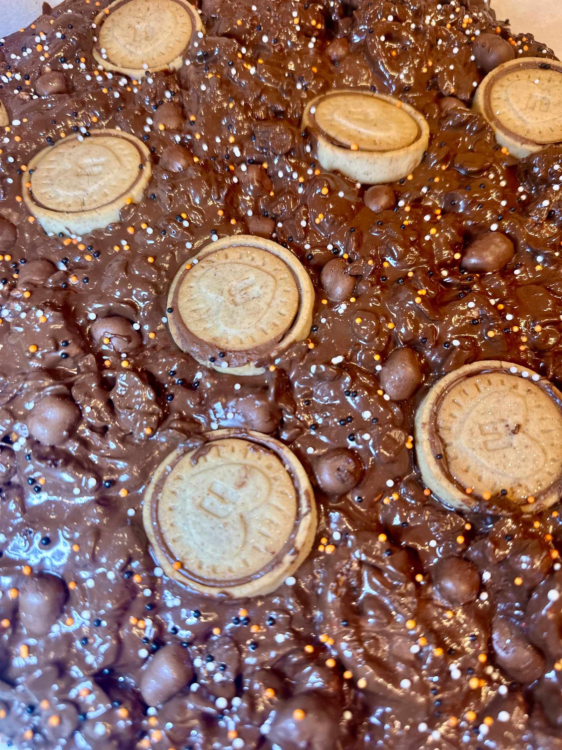 Milk & semisweet chocolate, gooey marshmallows, crunchy chocolate pretzels, edible chocolate covered brownie dough, Cocoa Krispies, and Nutella cookies… a graveyard of guilty pleasures. Dare to dig in. 🧛♀️