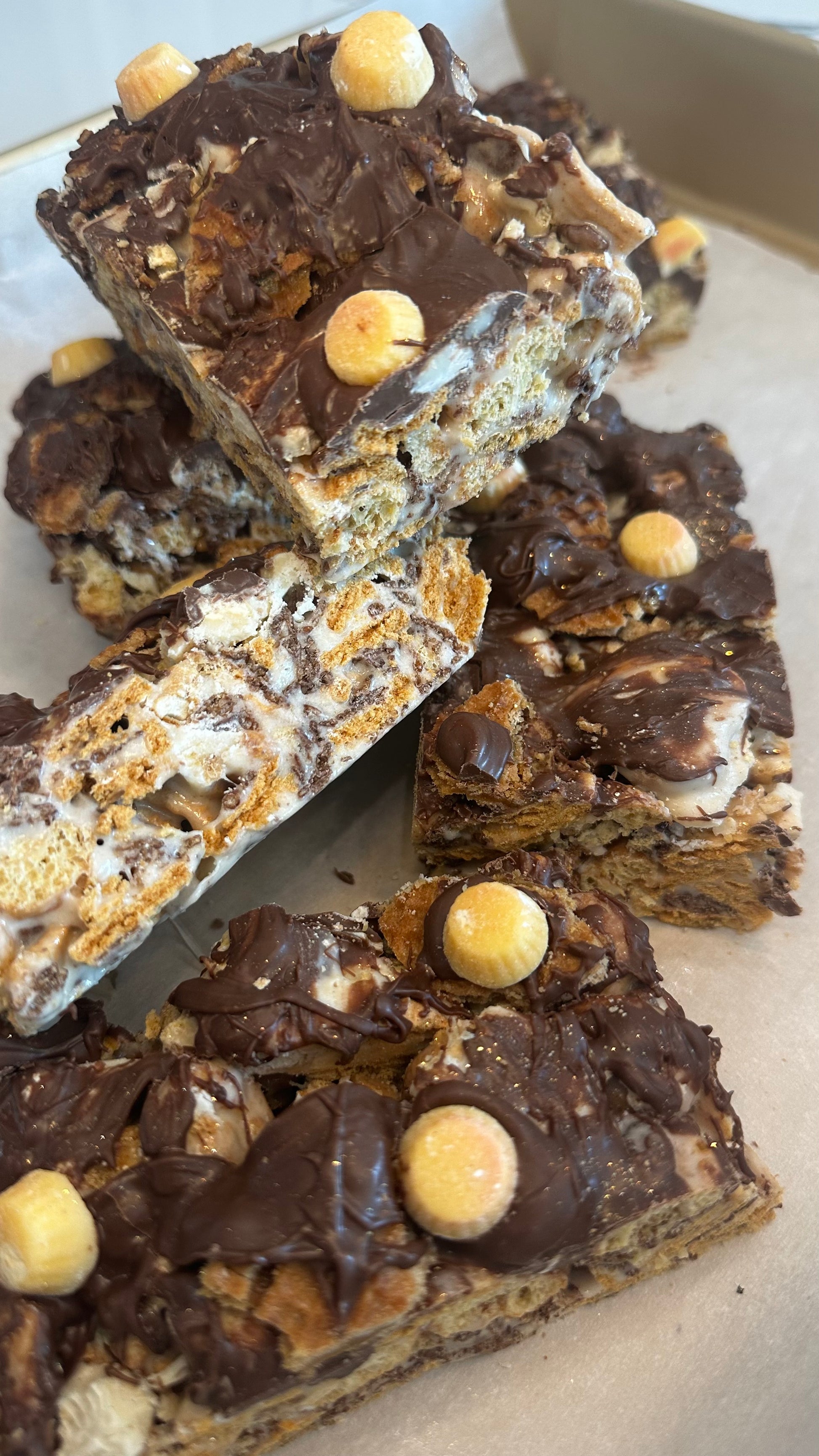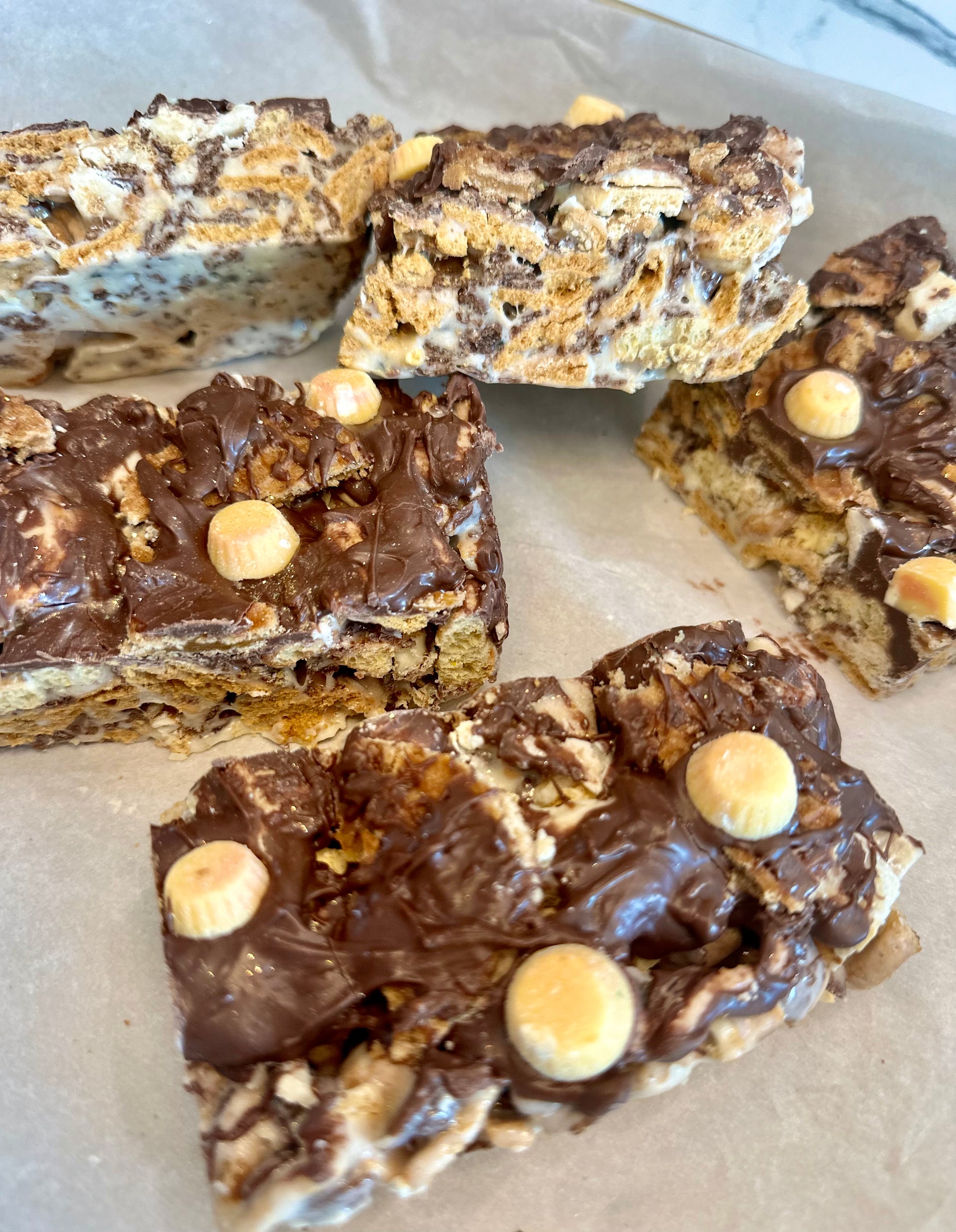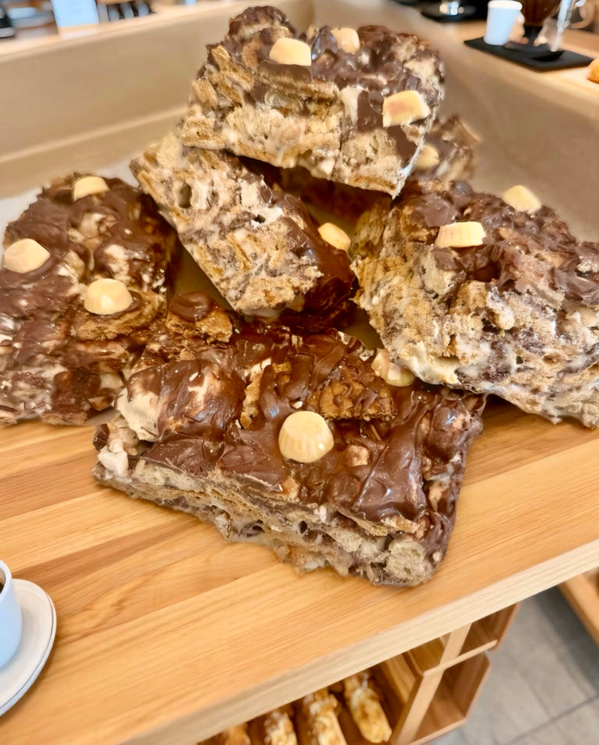 Cocoa Krispies, Whole Foods Cinnamon Bun, and Golden Grahams get mixed with gooey marshmallows, and a sprinkle of maple/apple Oreos/pumpkin pretzel bark. Then topped with milk chocolate, chopped maple bark, stroop waffles, and more milk chocolate, then decorated with mini pumpkin cups. 🥣