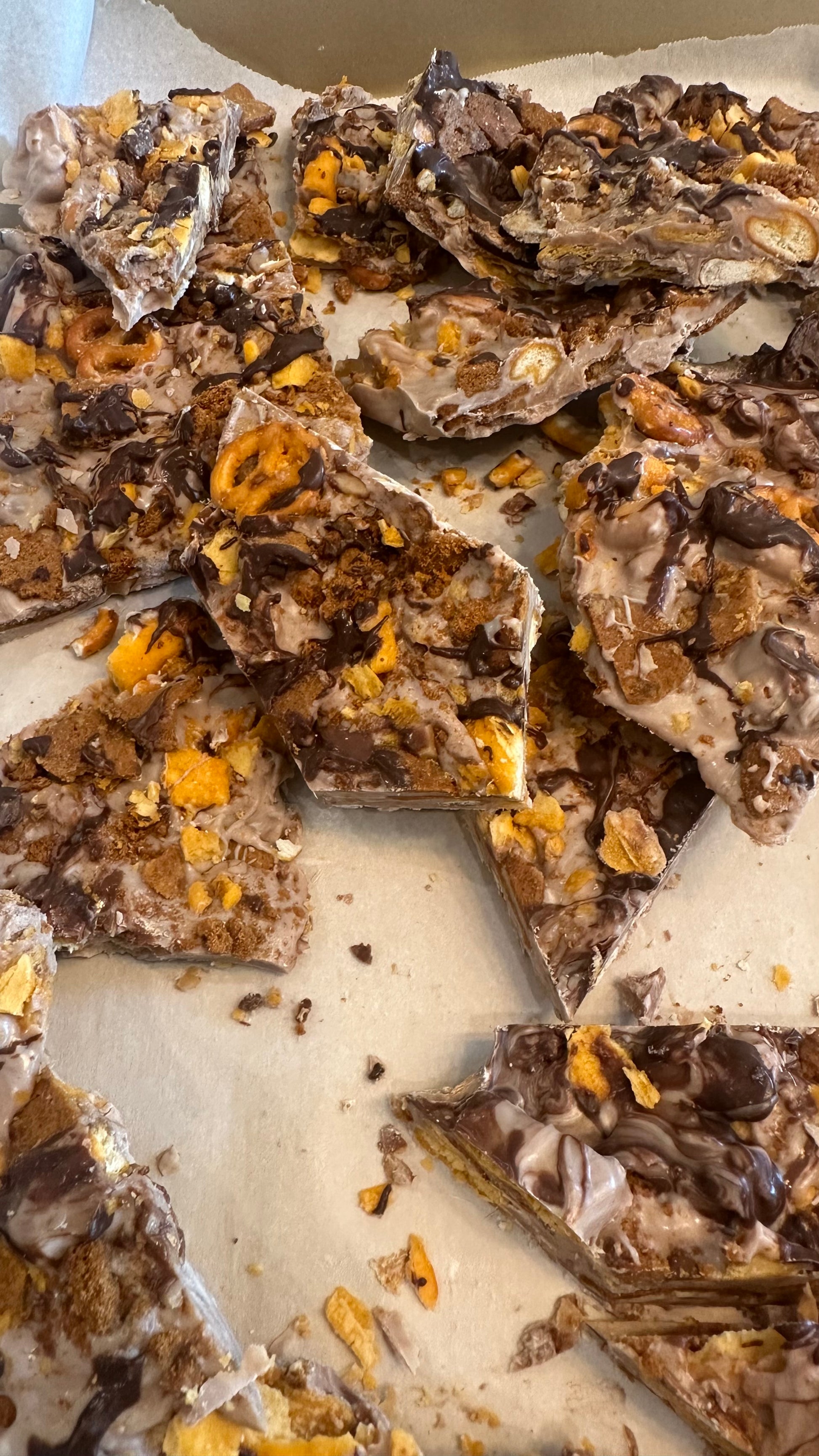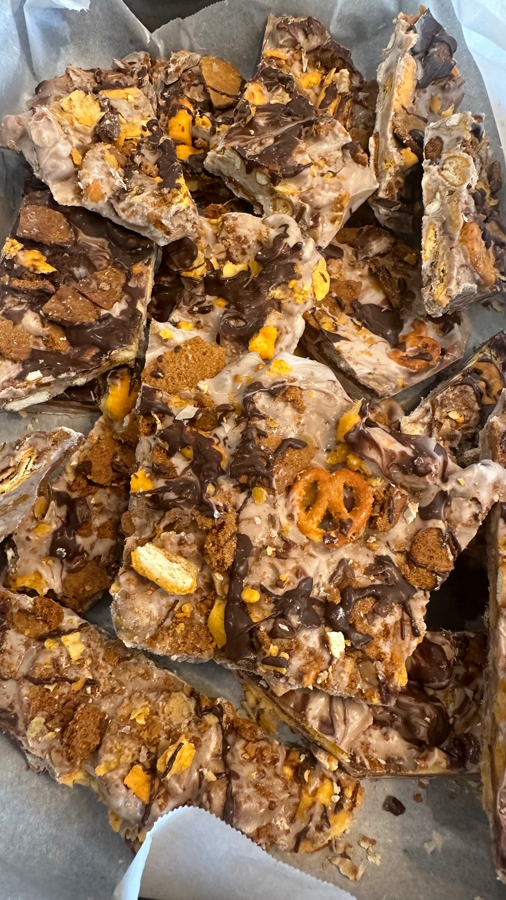 This is a salty sweet dream with white and milk chocolate swirled with cheeze it’s, bagel chips, pretzels, salty cheese straws, toffee pieces— topped with biscoff cookies, more toffee, more Cheesey chex, and drizzled with dark chocolate. 🍫