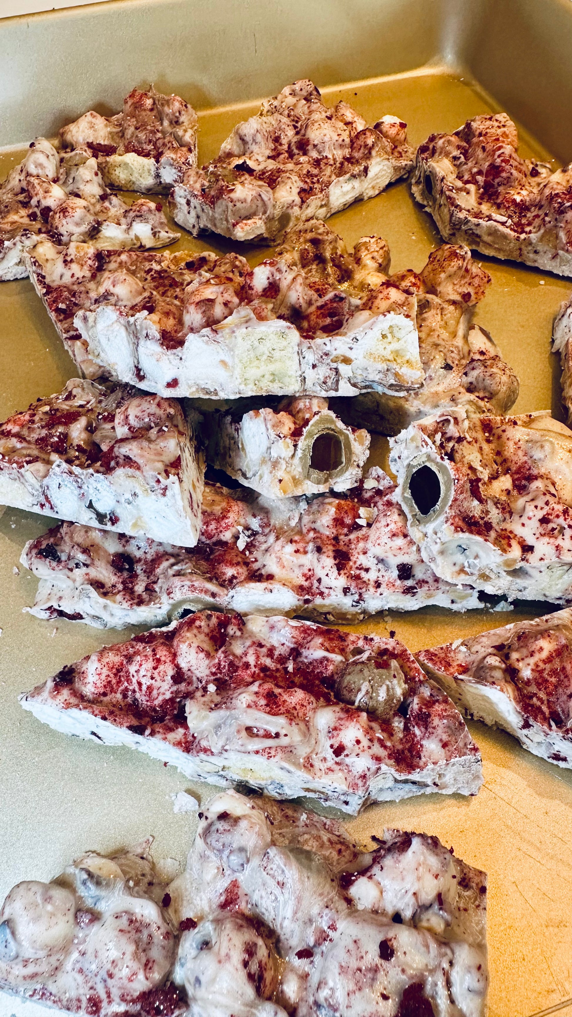 Freeze dried cherries infused white chocolate with marshmallows, biscotti, toasted macadamia nuts, chocolate coated milk tea boba pearls, and more cherries. Then topped with chewy chocolate pearls- boba pearls!