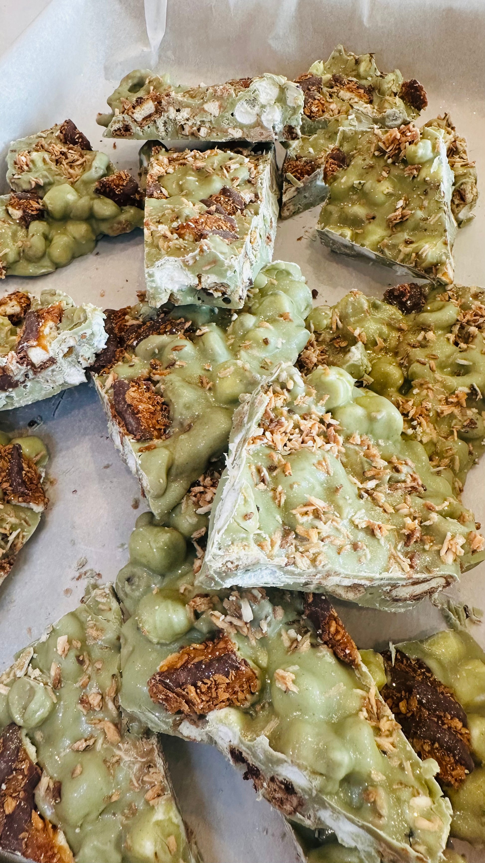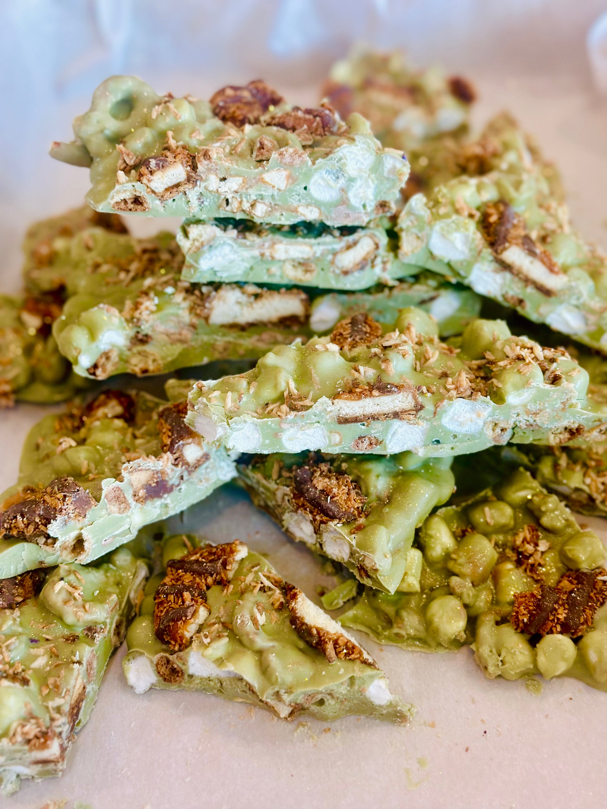 Matcha chocolate, homemade toasted chewy coconut brittle, Keebler Coconut Dreams cookies, tiniest chocolate chip cookies, gooey marshmallows, butter toffee pretzels, and melty salted caramel chips!