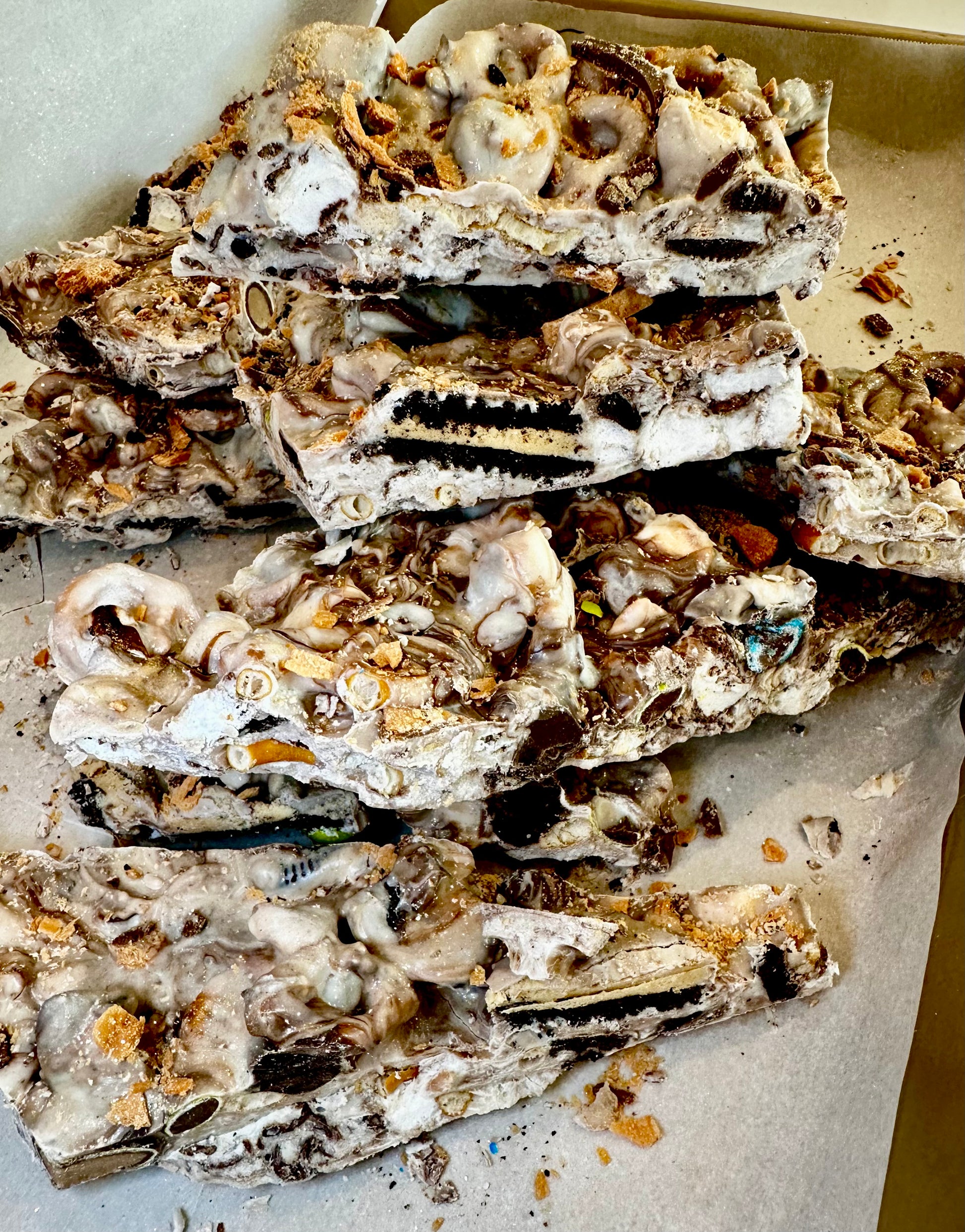 When sweet meets a little savage. Creamy white chocolate tangled with peanut butter Oreos, Butterfingers, Peanut Butter M&Ms, regular M&Ms, Cocoa Krispies, marshmallows, swirls of semisweet chocolate, and salty pretzels. It’s smooth, it’s crunchy, it’s downright irresistible—so good, you’ll forget how to behave. 😈