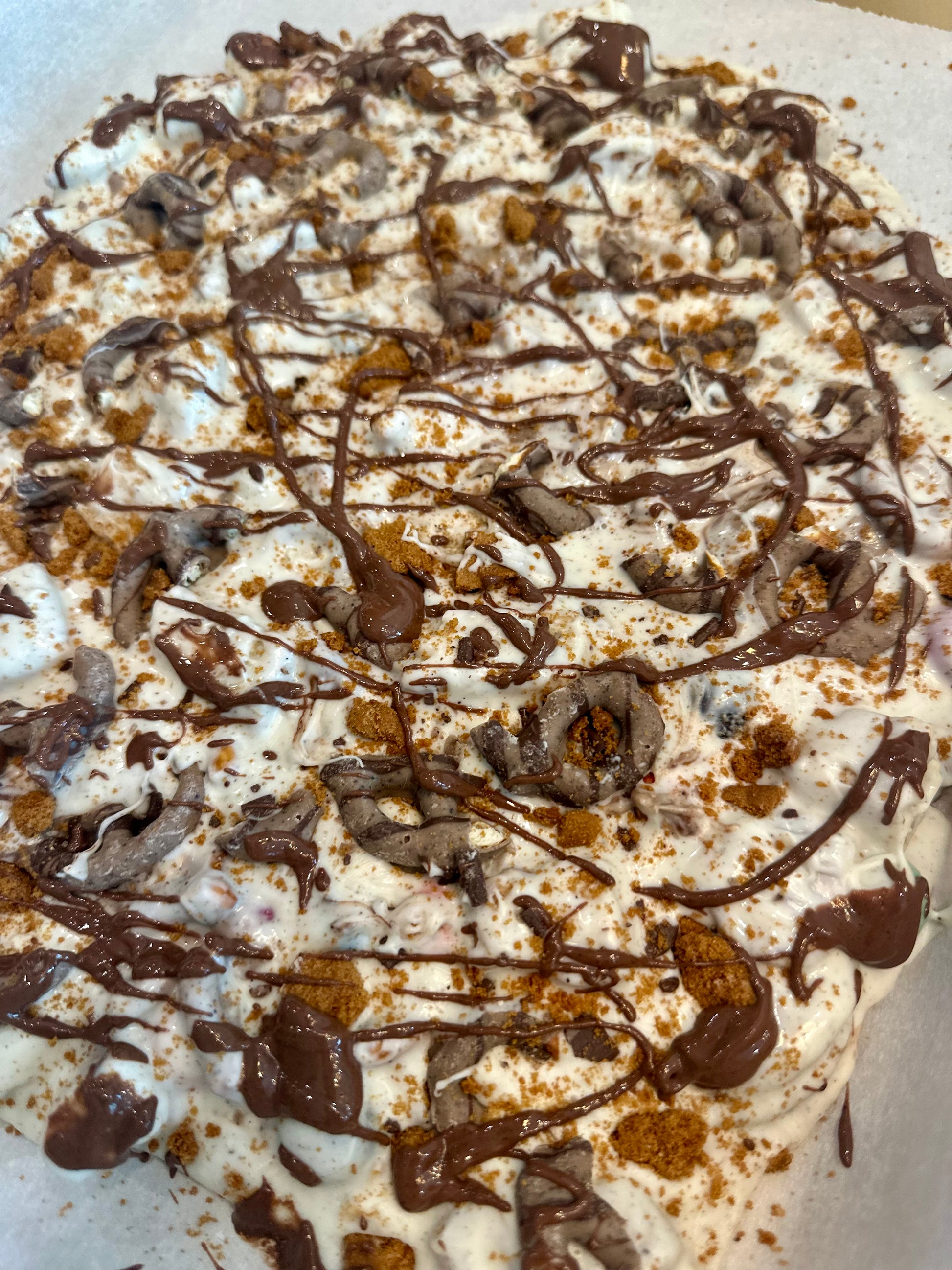 Cardamom infused white chocolate, Cold Brew Caramel M&Ms, Almond biscotti, Mocha Latte pretzels, Biscoff Sandwich Cookies— Topped with biscoff cookies and more mocha pretzels, then drizzled with espresso milk chocolate.
