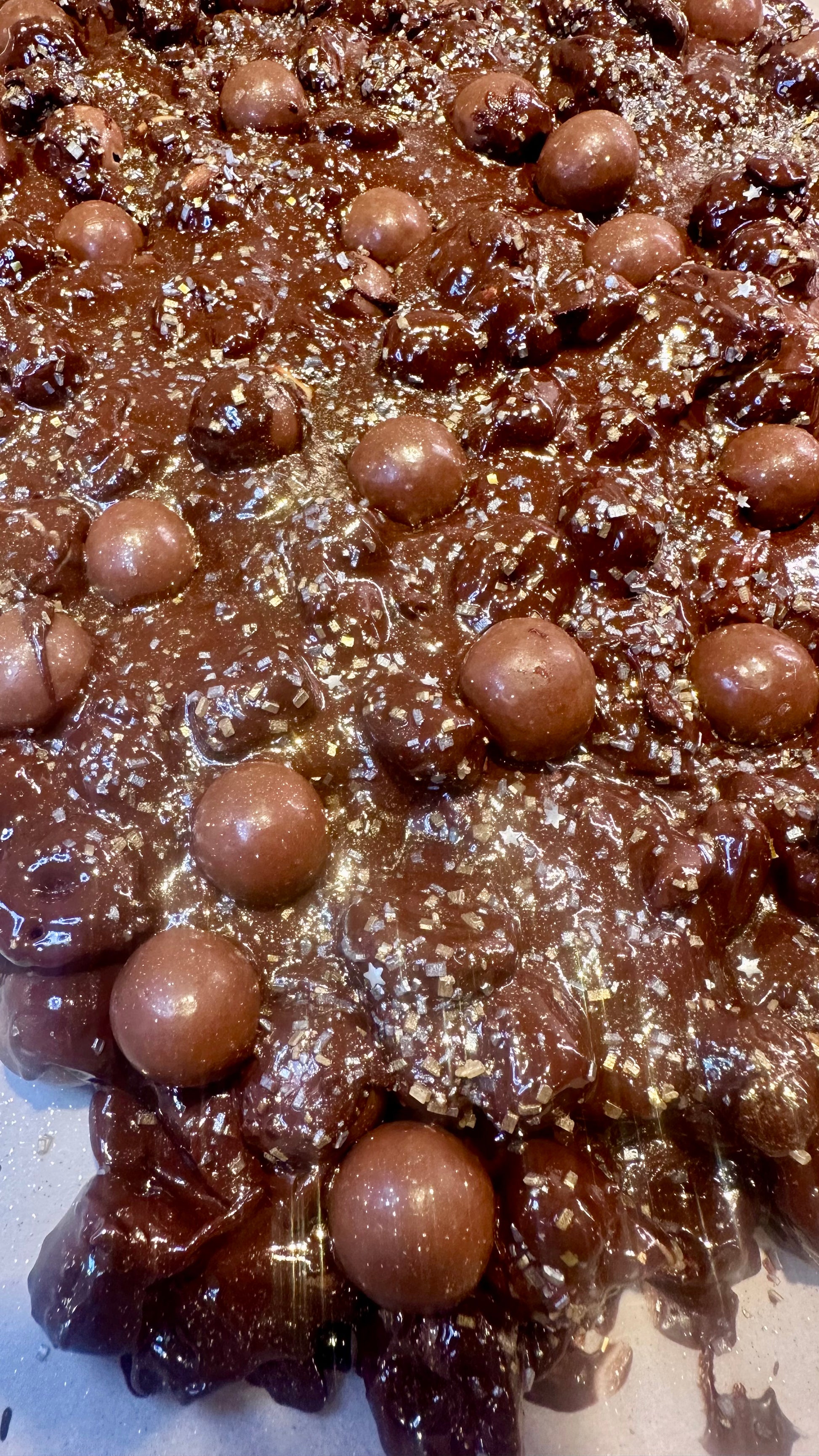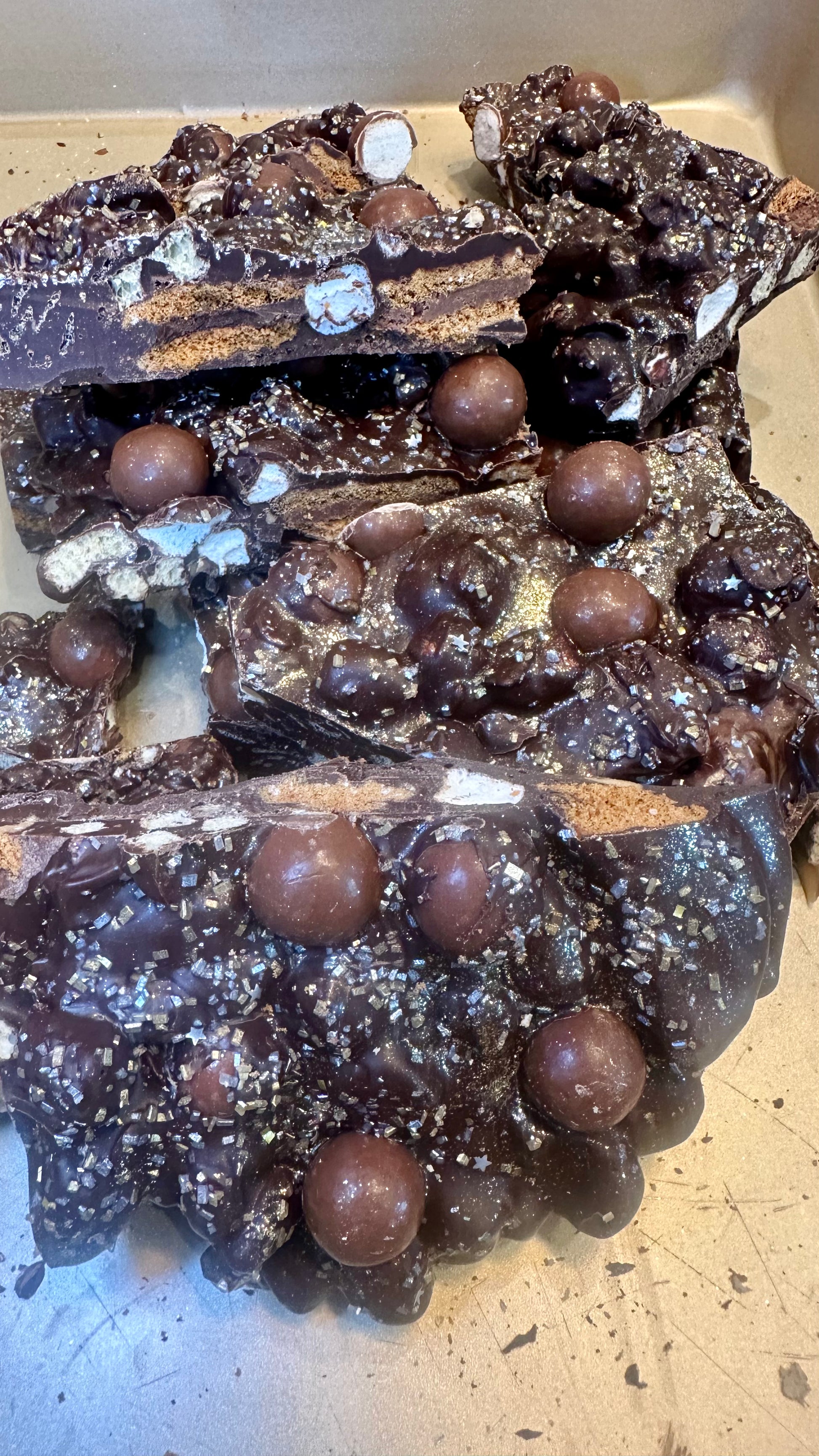 Milk and dark chocolate mixed with Three Wishes Hot Cocoa Cereal, Cocoa Pebbles, marshmallows, Biscoff chocolate sandwich cookies, butterscotch chips, and topped with Whoppers malt balls.