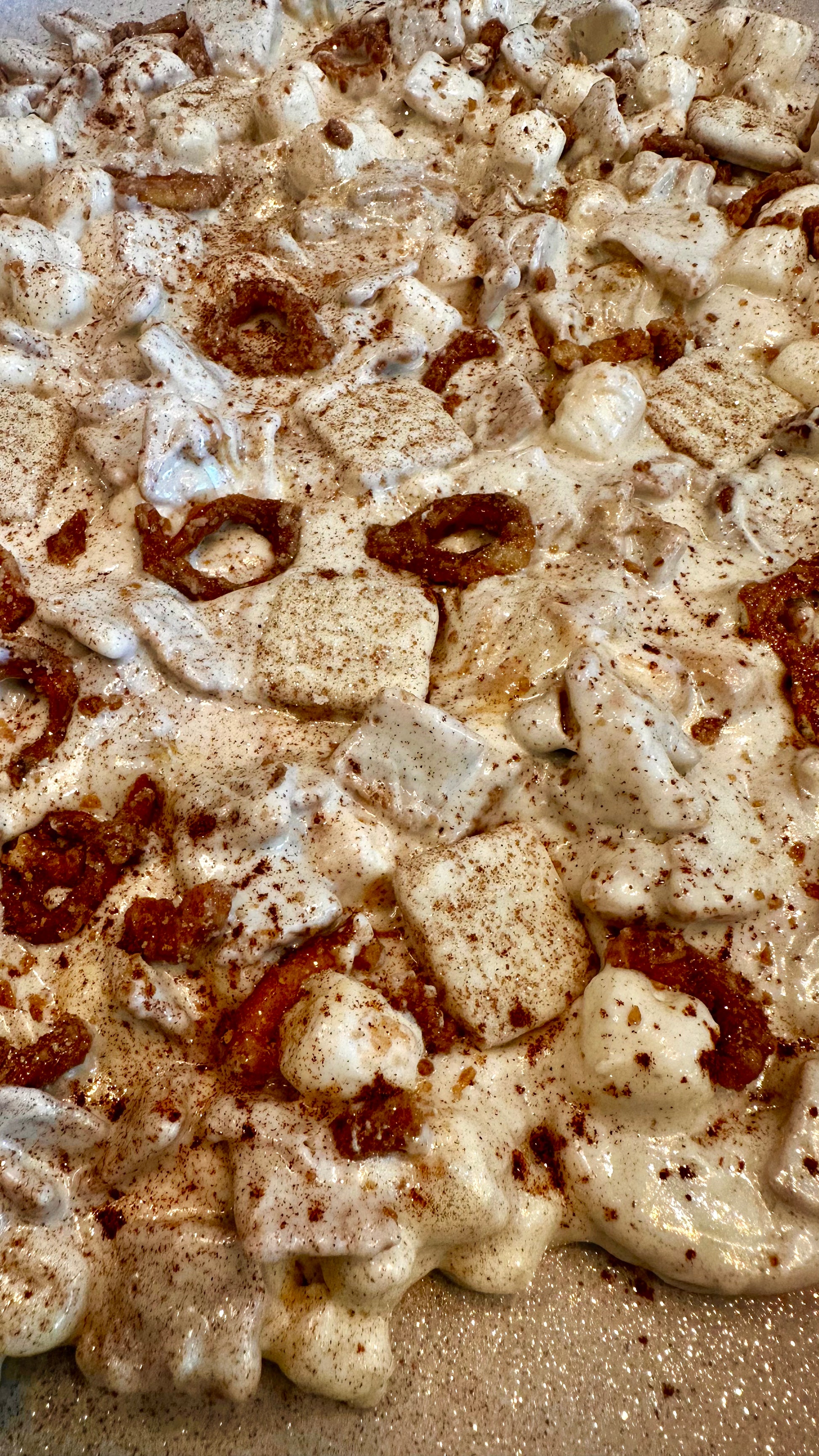 Cinnamon Toast Crunch cereal, Apple Pie Oreos, butter toffee pretzels, marshmallows, peanut butter chips.