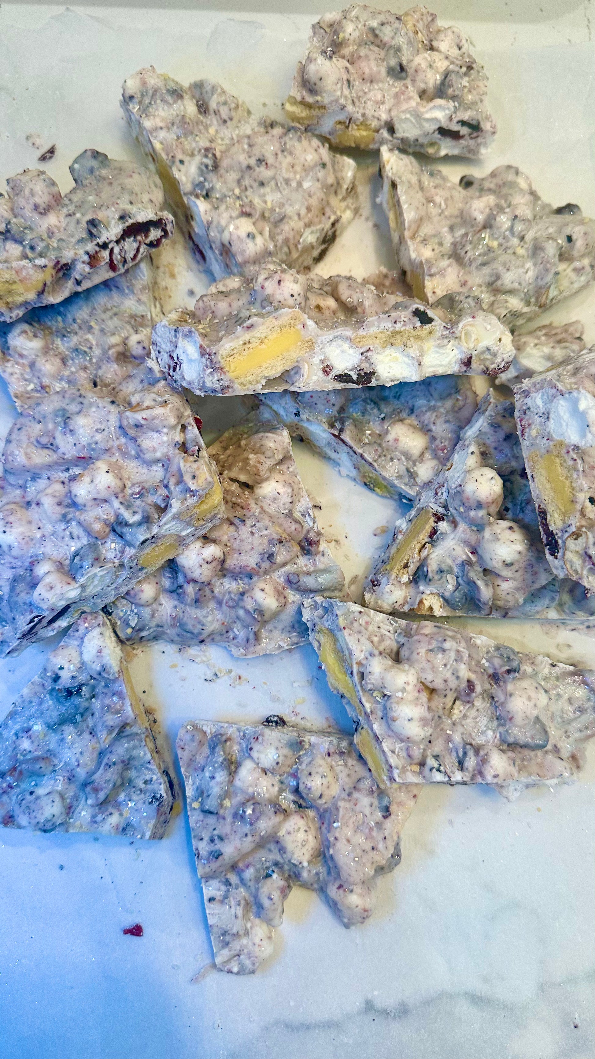 Blueberry vanilla white chocolate with cranberries and dried cherries, lemon Oreos, marshmallows, freeze dried blueberries, and salty blueberry & white chocolate pretzels.
