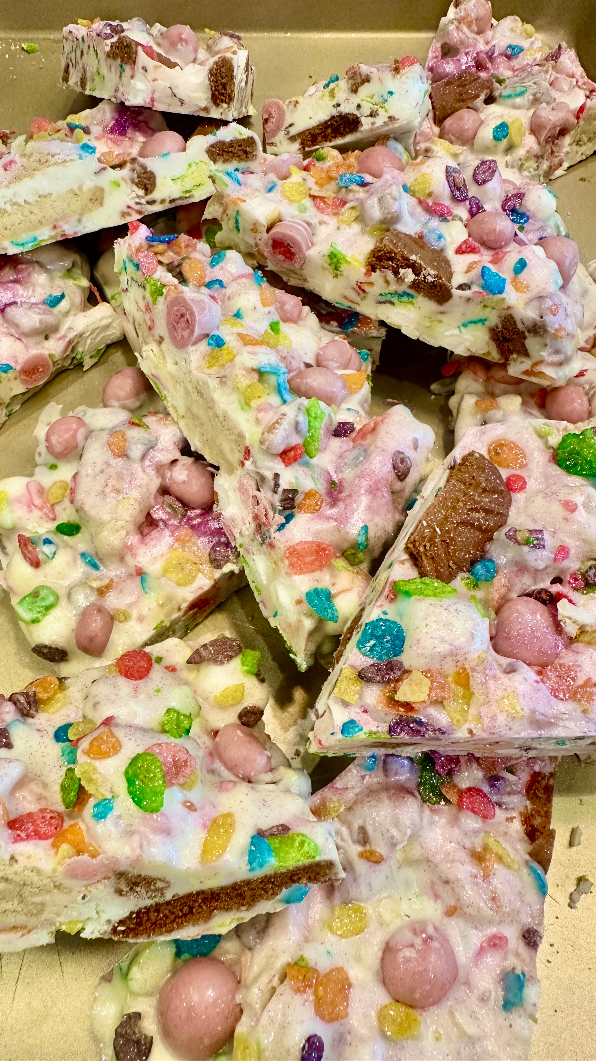 Fruity pebbles, marshmallows, biscoff cookies, golden double stuffed Oreos, freeze dried yogurt strawberries, edible glitter.