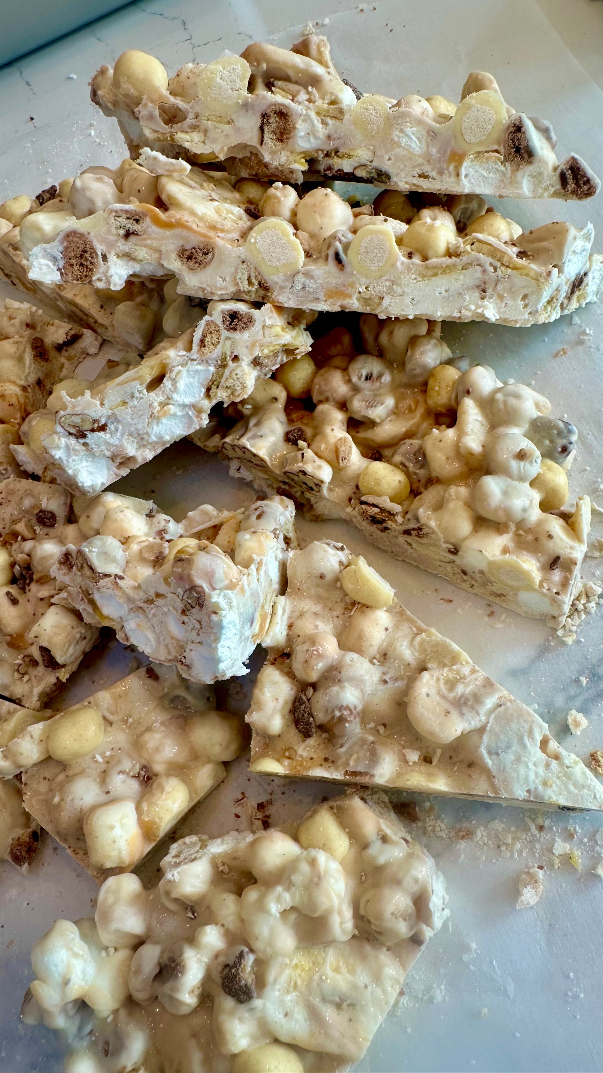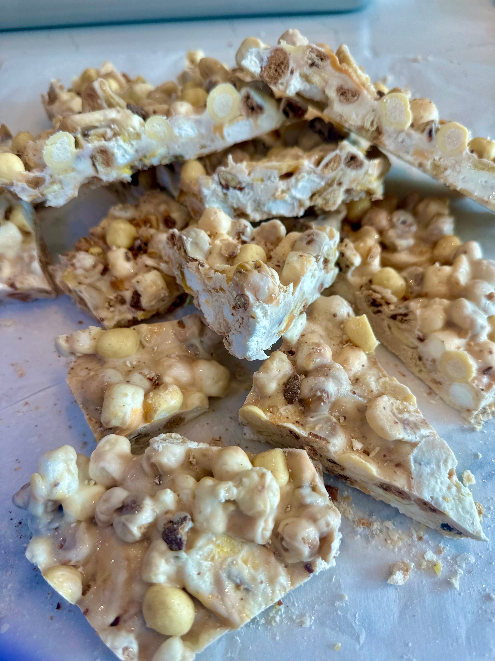 White chocolate (slightly maple) bark with banana chips, pecans, marshmallows, and tiny chocolate chip cookies, salty toffee bits, and butterscotch chips, topped with edible Cinnamon Bun cookie dough bites.