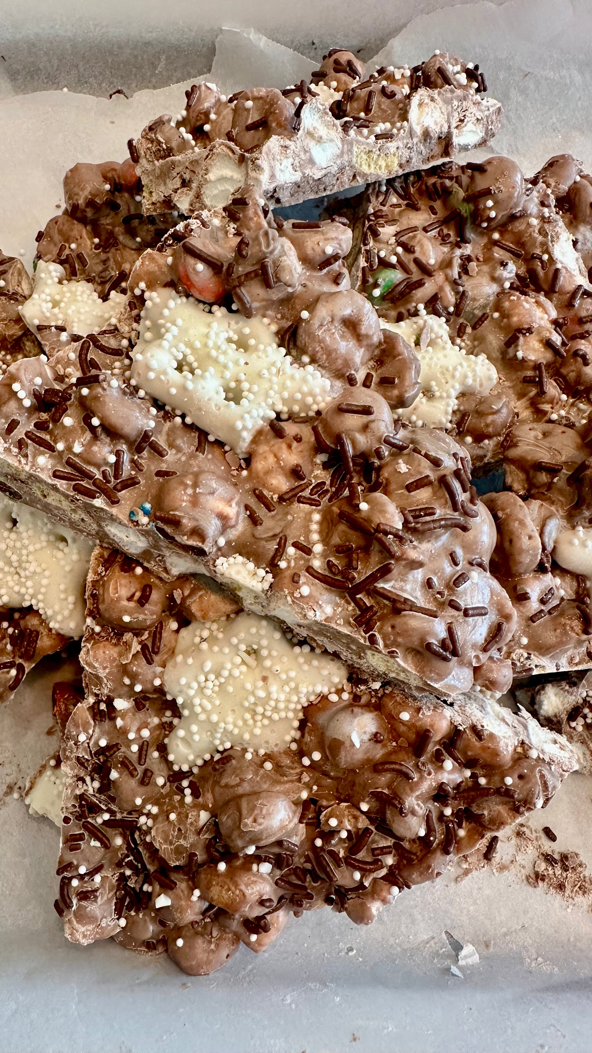 White and semisweet chocolate mixed with dark cocoa powder swirls, marshmallows, Three Wishes Hot Cocoa Cereal, smidge of Cocoa Pebbles, hand smoked spicy crushed red pepper and Vietnamese cinnamon, Dark Chocolate M&Ms, topped with white chocolate snowflake pretzels and chocolate sprinkles.