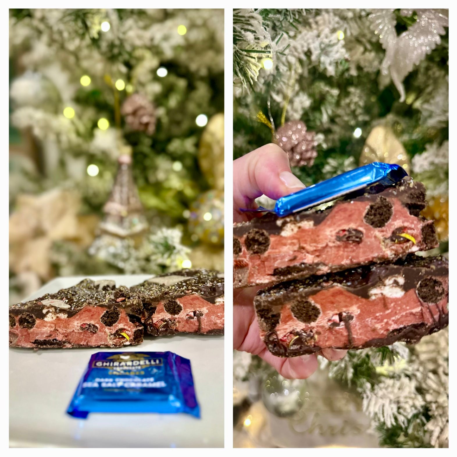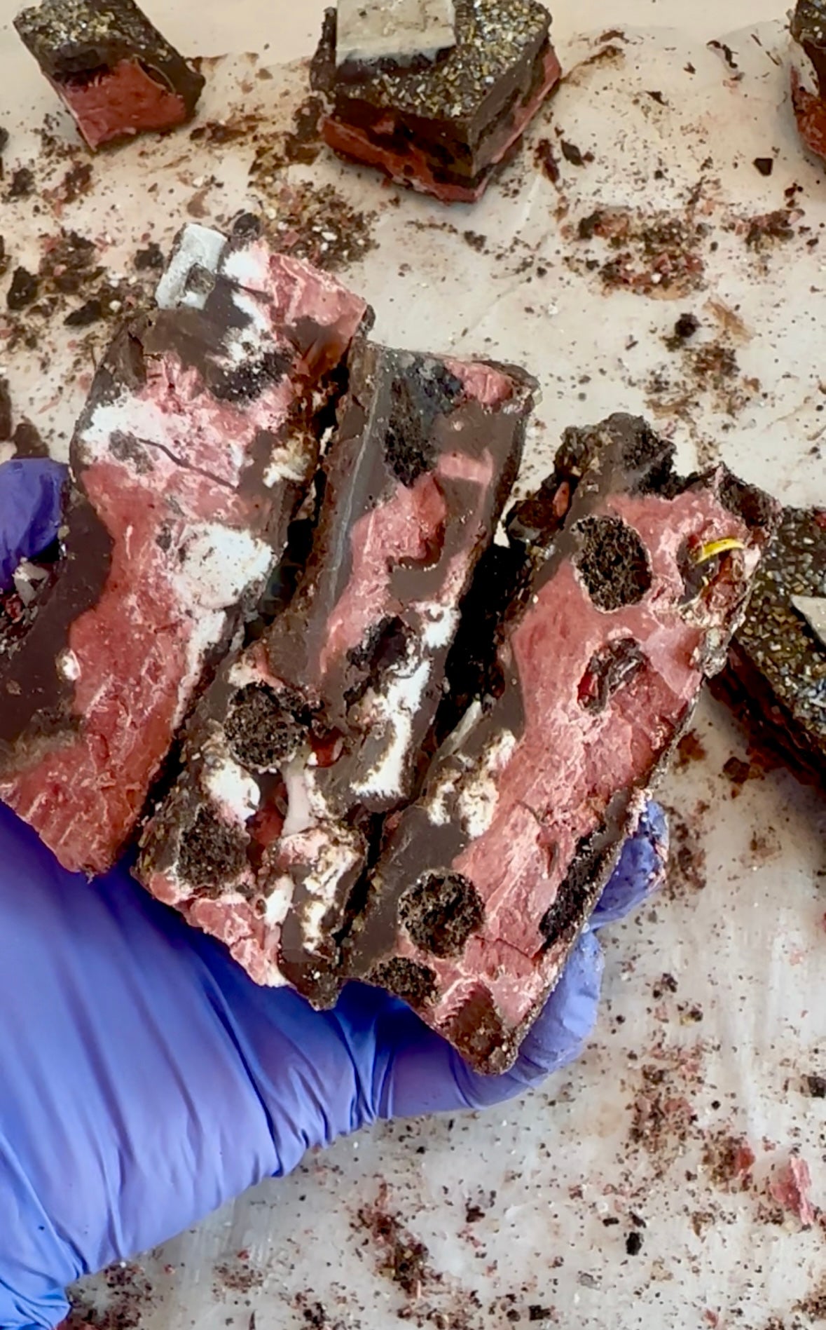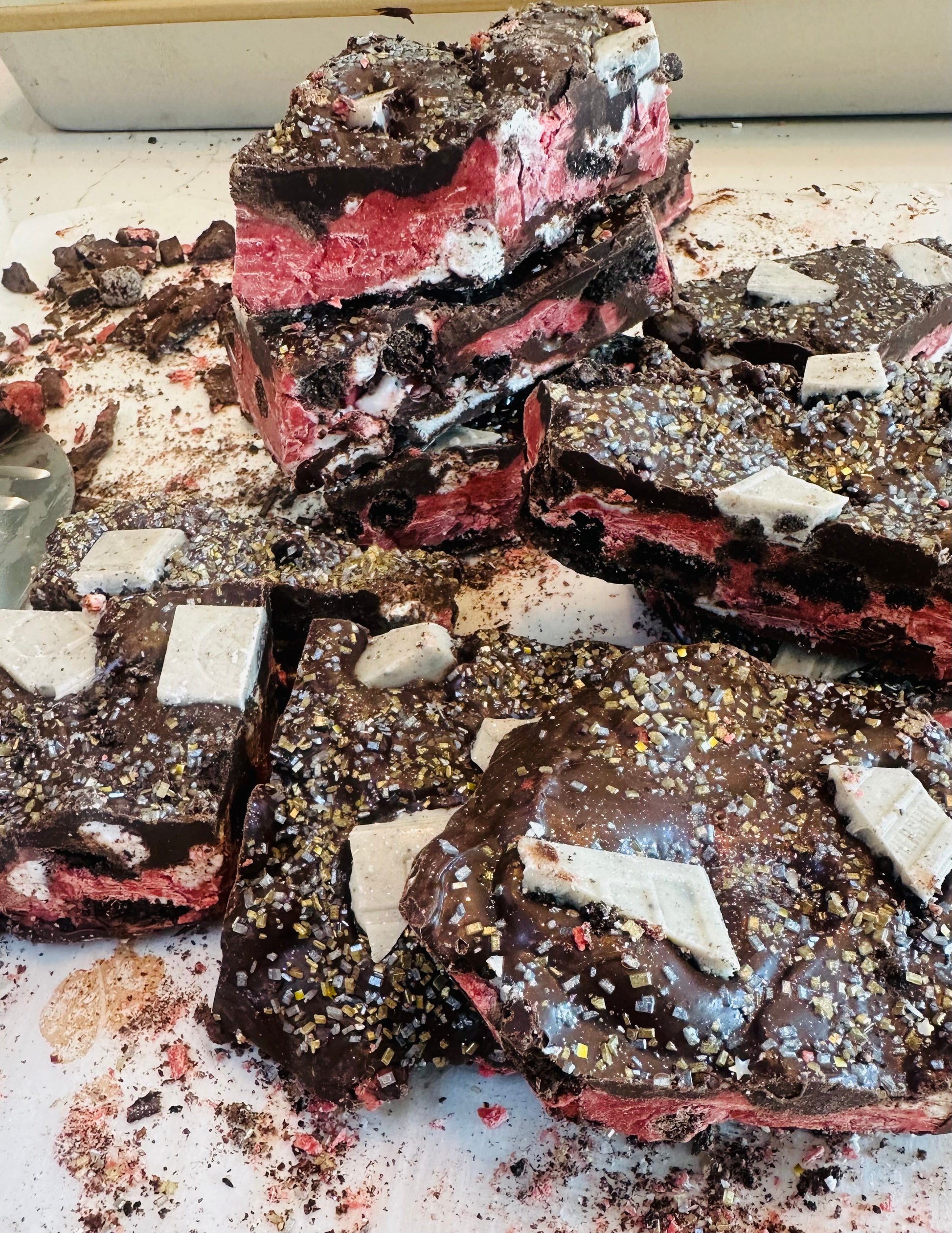 Red velvet marshmallow fudge bark is mixed with Oreo Puffs cereal, dark chocolate Oreos, dark chocolate M&Ms, and marshmallows. The bottom is coated in a thin layer of chocolate and cookie crumbs. The top is a thick, rich chocolate layer with sprinkles and chunks of cookies ‘n cream chocolate.Â