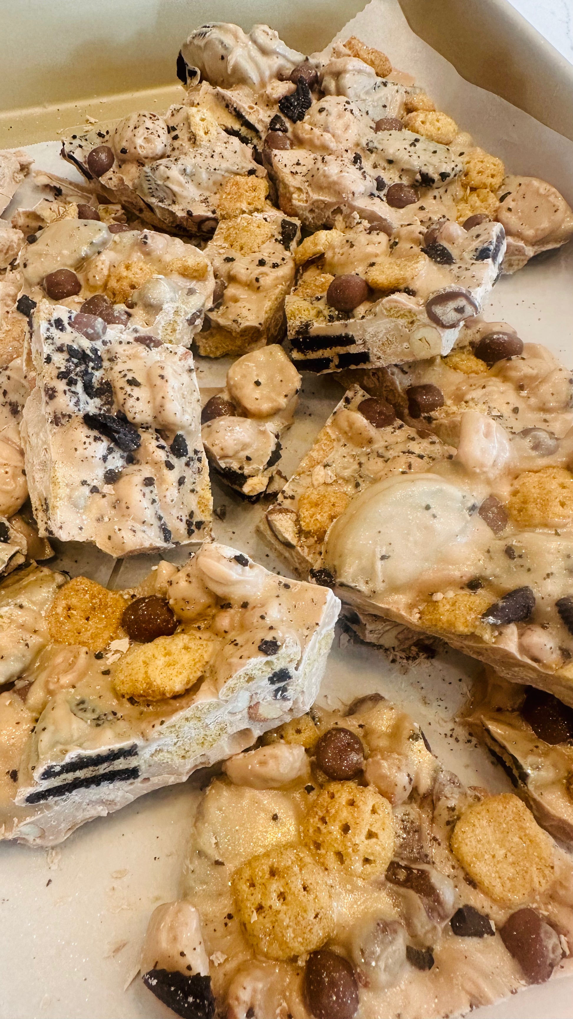 Salted caramel waffles with waffle toast crunch cereal, salted caramel chips, honey roasted peanuts, peanut butter Oreos, and edible chocolate chip cookie dough bites.