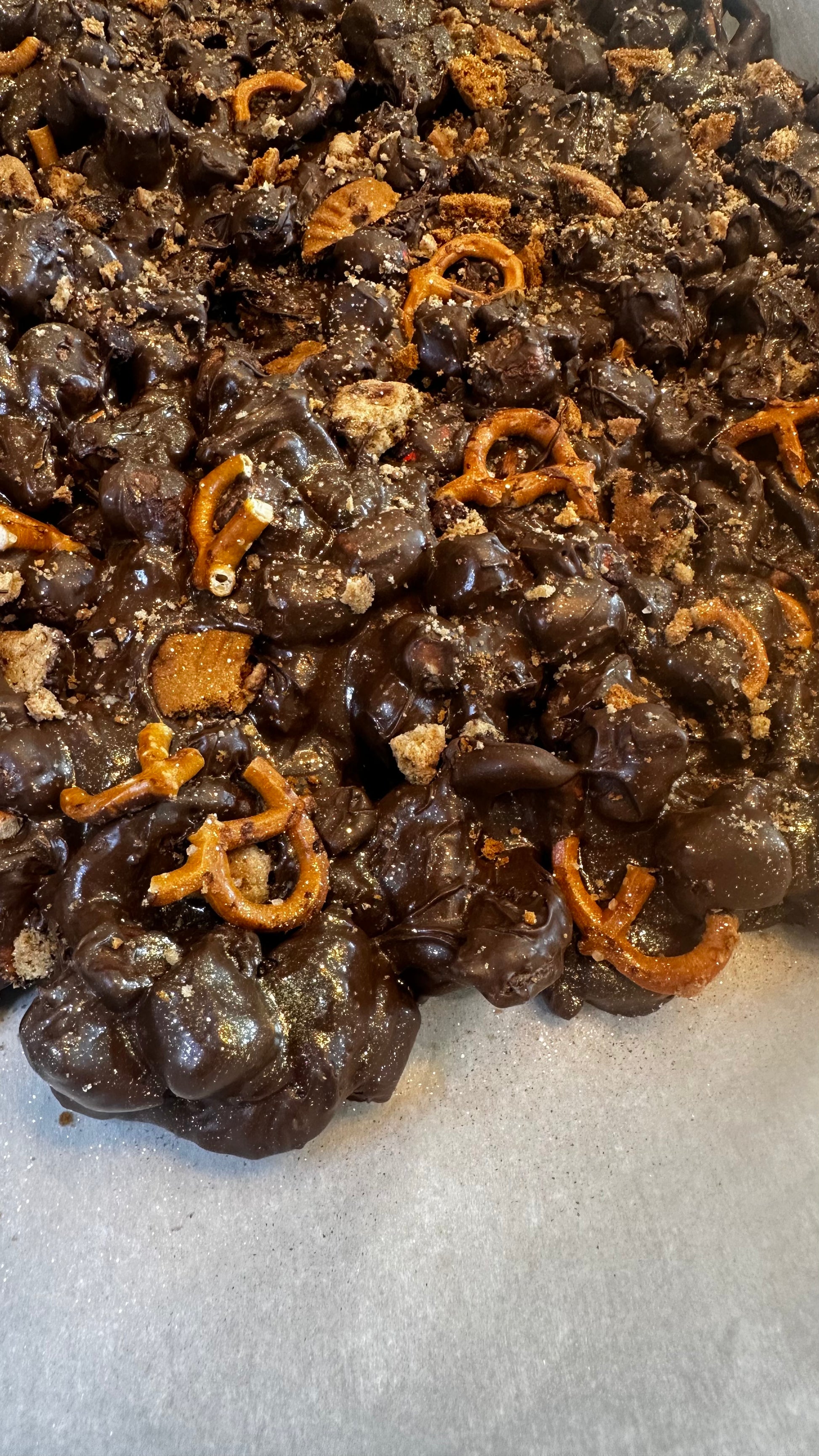 Milk and dark chocolate infused with Japanese matcha, pretzels, Reese’s peanut butter chips, peanut butter M&Ms, chocolate chip cookies, marshmallows, and Biscoff cream sandwich cookies.