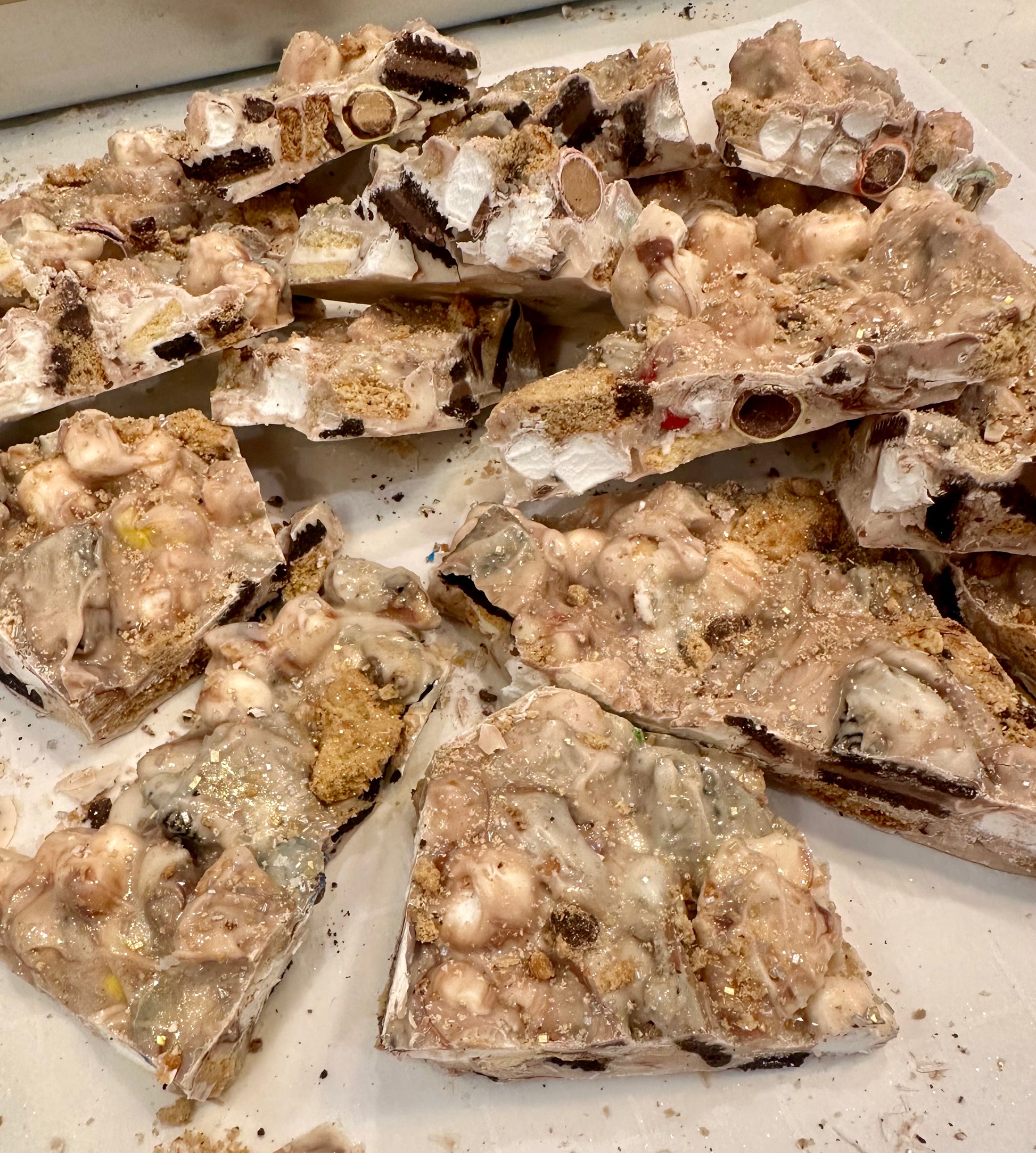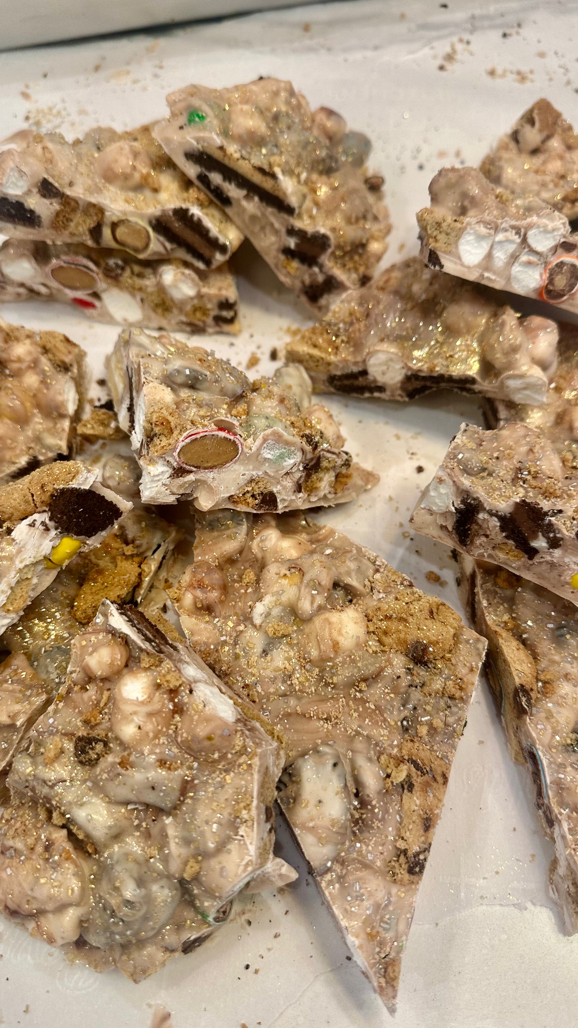 White chocolate bark swirled with Dark Chocolate Cocoa,Β dark chocolate Oreos, peanut butter Oreos, golden Oreos, chocolate chip cookies, milk chocolate chips, marshmallows, & giant peanut butter M&Ms.Β