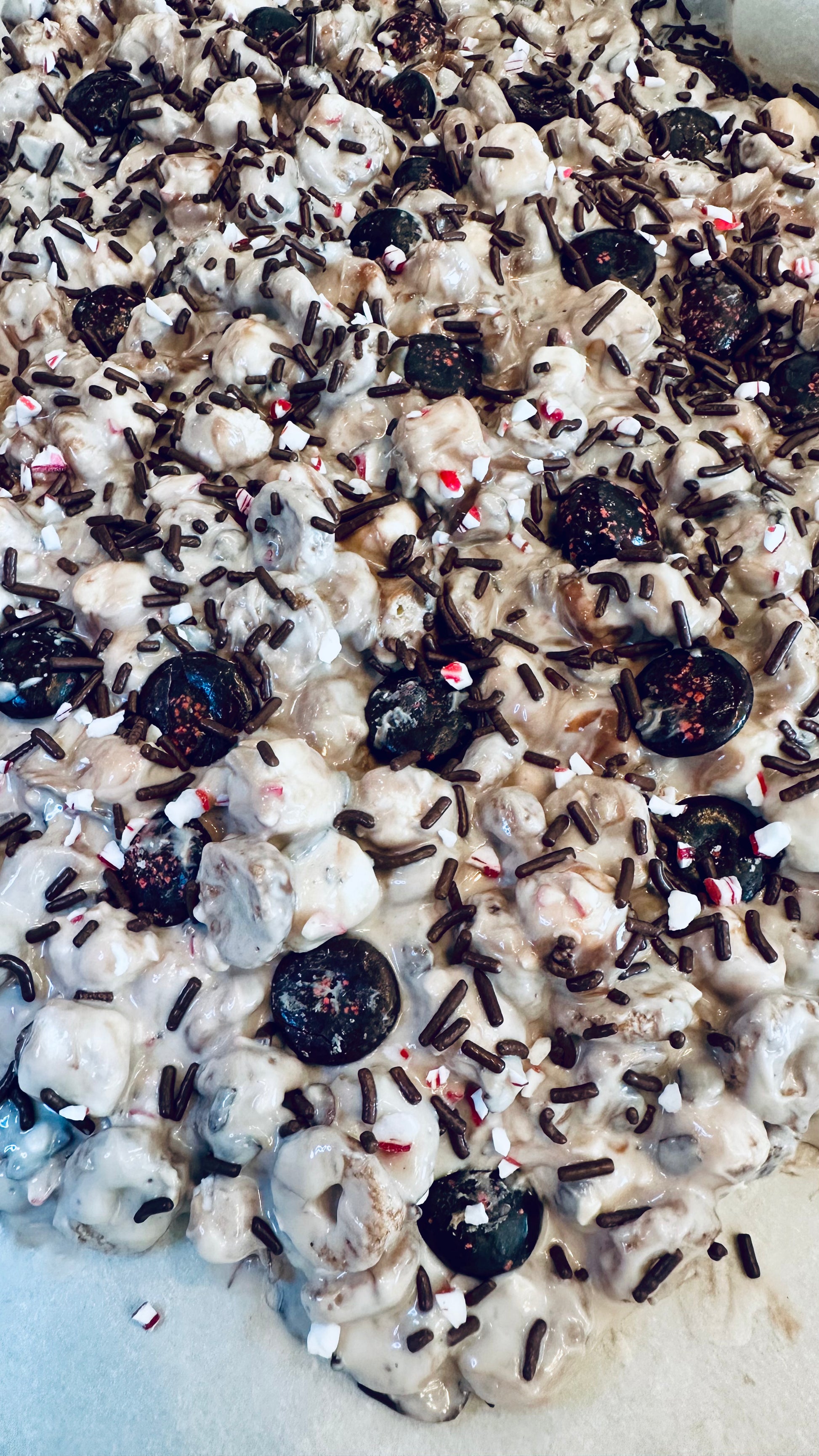 White chocolate bark infused with allergy-friendly crushed peppermint, Hersheys milk chocolate morsels, dark cocoa powder swirls, marshmallows, Three Wishes Hot Cocoa Cereal, smidge of Cocoa Pebbles, Junior Mints Peppermint Crunch candies, and chocolate sprinkles.