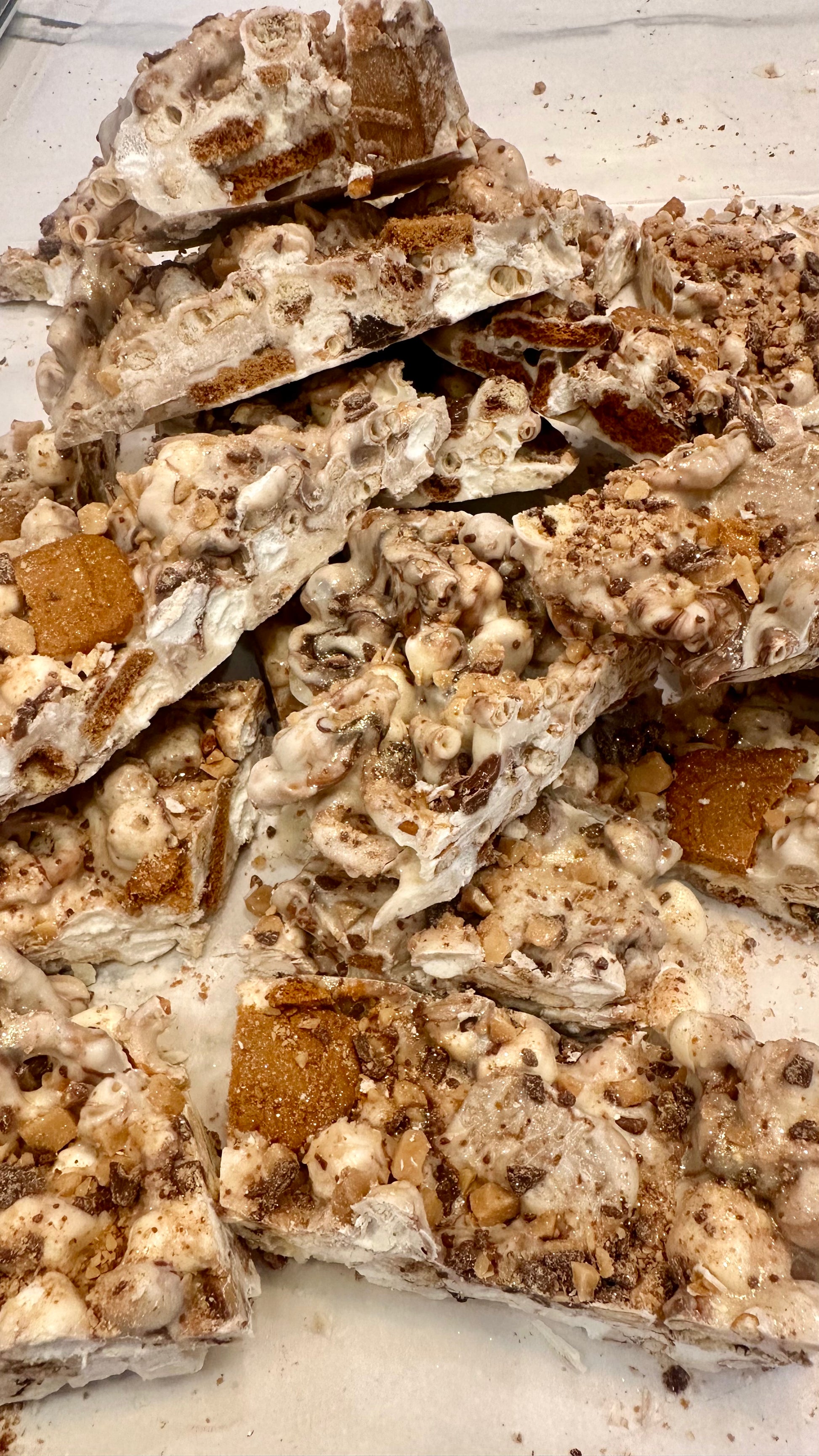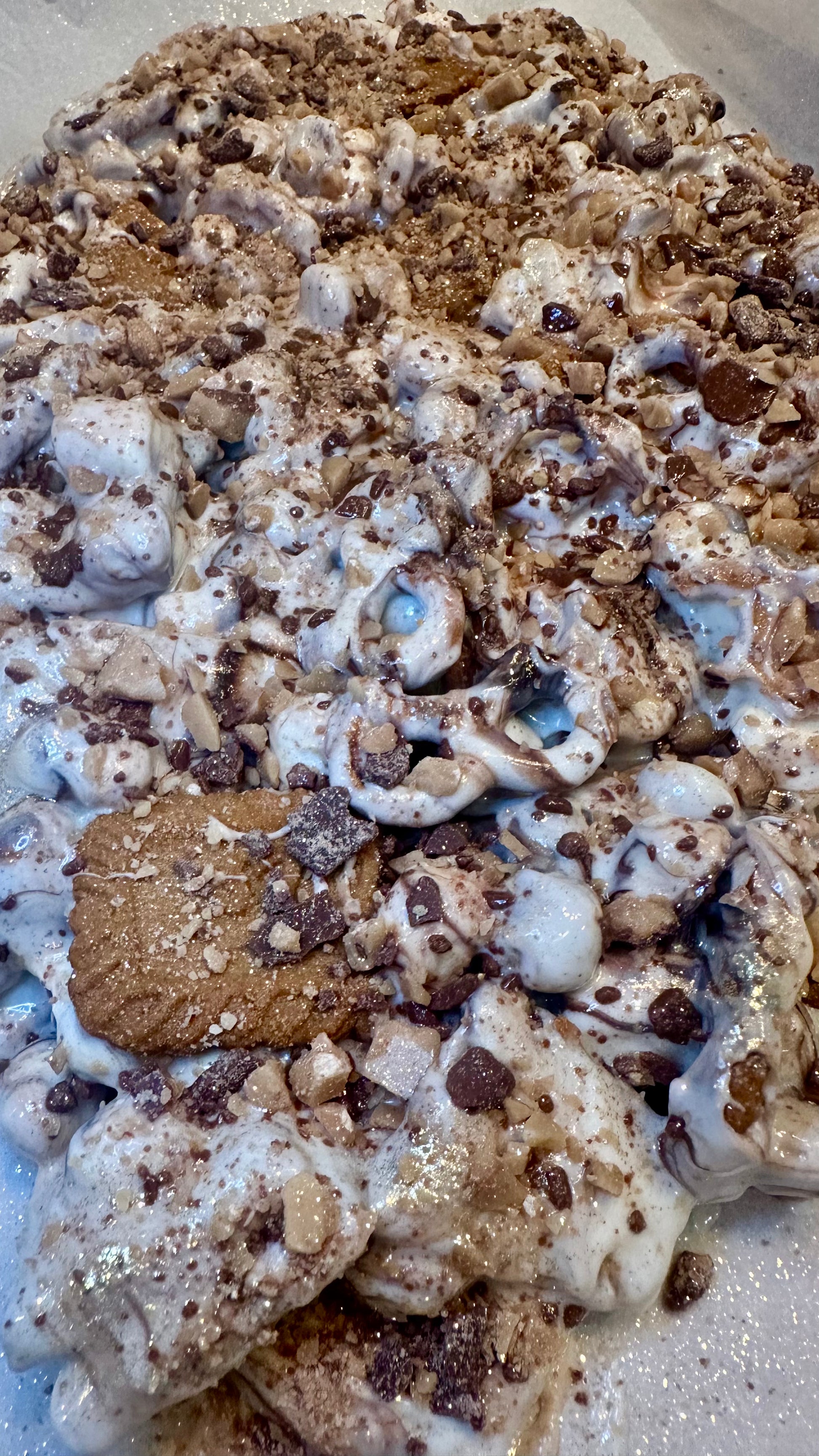 White chocolate bark swirled with semisweet chocolate chips, marshmallows, biscoff cookies, salty pretzels, tiniest chocolate chip cookies, and covered in crushed Heath bars.Β