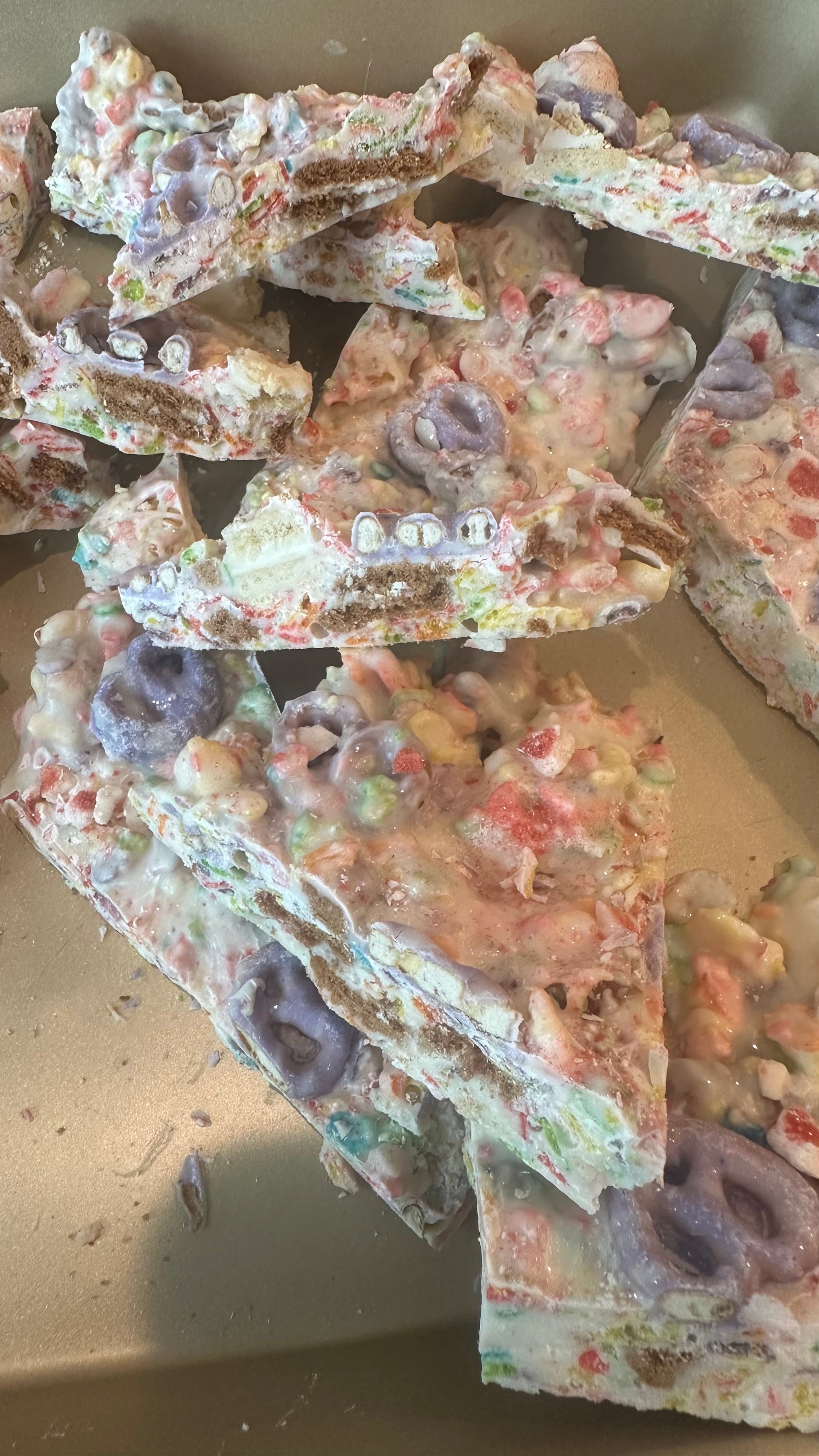 A dreamy white chocolate bark loaded with Fruity Pebbles, Biscoff sandwich cookies, vanilla Oreos, ube pretzels, and crushed Tru Fru strawberries. Sweet, crunchy, and nostalgic ā like the last sip of your favorite childhood cereal.Ā